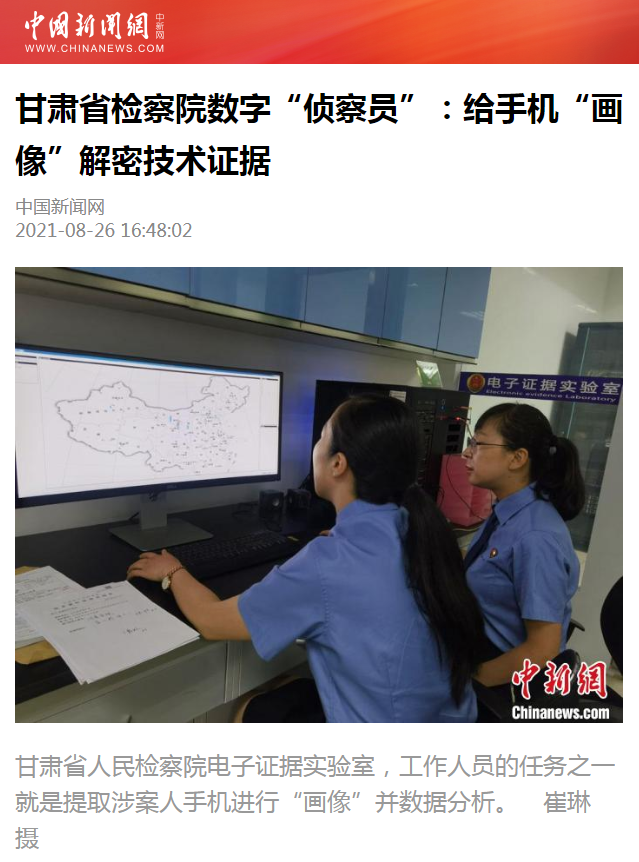 2021年8月26日,中國(guó)新聞網(wǎng)發(fā)布新聞《甘肅省檢察院數(shù)字“偵察員”:給手機(jī)“畫(huà)像”解密技術(shù)證據(jù)》。