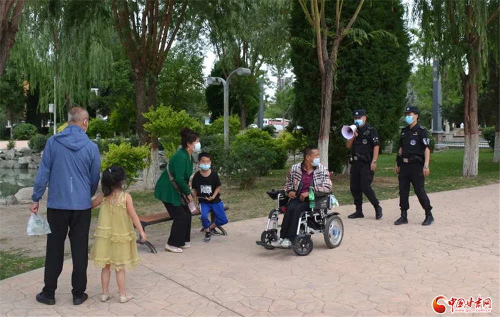 永登公安巡邏特警隊(duì)員在公園等公共場(chǎng)所手持小喇叭勸導(dǎo)群眾戴口罩少聚集不出門(mén)。永登縣局 徐大明/攝
