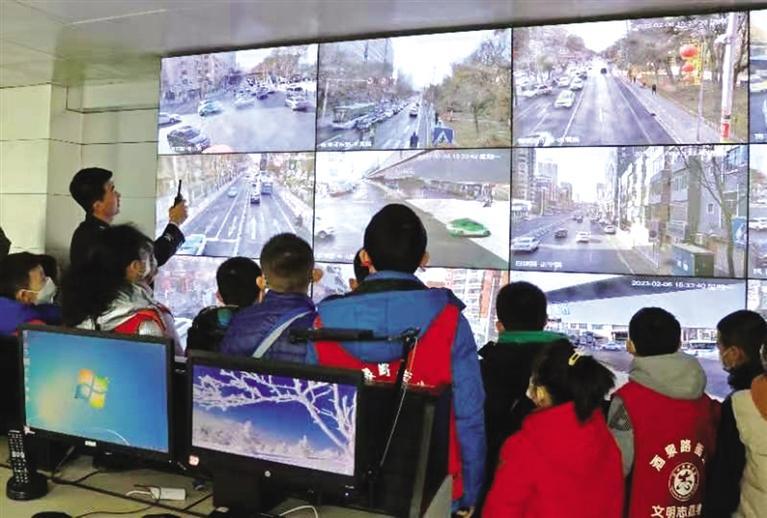 在指揮中心,民警向孩子們介紹了監(jiān)控視頻,講解了電子警察的作用,并通過監(jiān)控畫面詳細講解交警日常查處違法及出警派警流程。