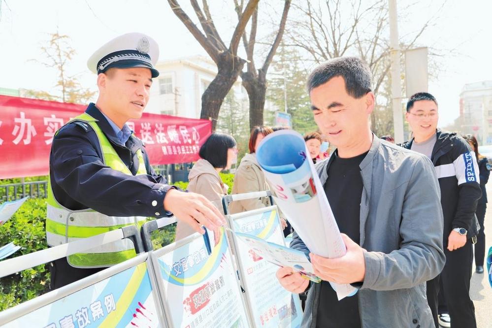 民警給過(guò)路群眾發(fā)放宣傳資料。4月8日,鎮(zhèn)原縣公安局交警大隊(duì)開(kāi)展“春風(fēng)送法暖民心”主題宣傳活動(dòng)。新甘肅·甘肅法治報(bào)記者馬志國(guó)攝