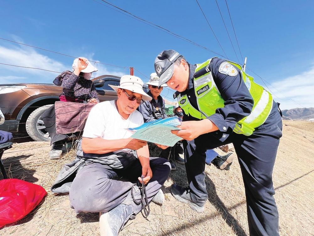 民輔警向群眾講解交通安全知識。近日,碌曲縣公安局交警大隊(duì)民輔警借助夏澤灘春季賽馬活動(dòng)有利時(shí)機(jī),開展“美麗鄉(xiāng)村行”交通安全巡回宣傳活動(dòng)。 新甘肅·甘肅法治報(bào)記者金凡裕攝