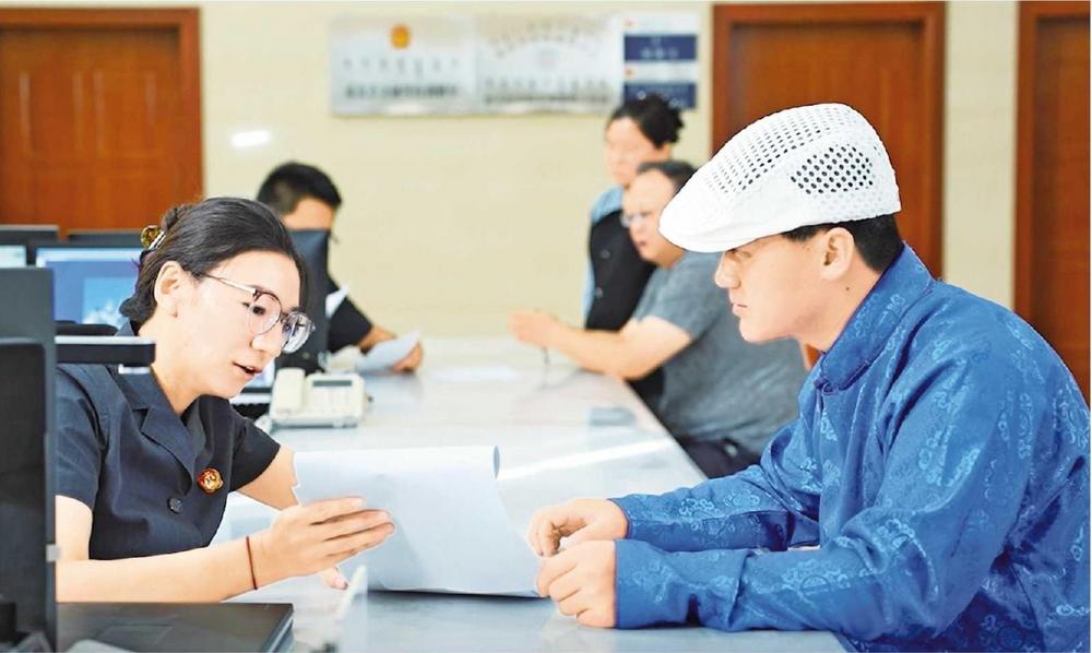肅北縣人民法院立案庭蒙漢雙語法官助理接待當事人(2025年8月拍攝)。