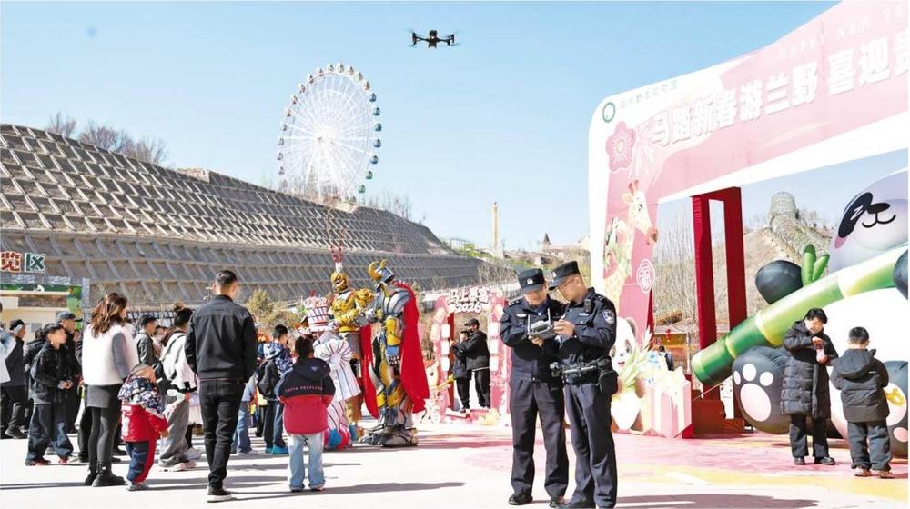 春節(jié)假期,蘭州市公安局安寧分局民輔警在景區(qū)護航游客安心游玩。新甘肅·甘肅法治報通訊員 張軍揚 攝