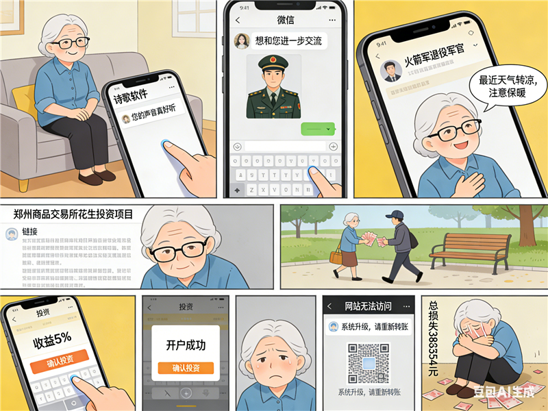 警方拆解該案騙術(shù)發(fā)現(xiàn),騙子共分七步將紀(jì)奶奶從“詩友”變成“提款機(jī)”。第一步,潛入詩歌朗誦這類中老年人聚集的興趣社群,精準(zhǔn)篩選目標(biāo);第二步,以“聲音好聽”為切入點(diǎn),通過情感鋪墊營造“黃昏戀”錯覺,建立情感依賴;第三步,多次切換聊天軟件,躲避平臺反詐監(jiān)測;第四步,偽裝“火箭軍”身份,利用老一輩對軍人的天然信任感,以國家信譽(yù)背書;第五步,讓老人幫忙操作虛假賬戶,親眼見證“穩(wěn)賺5%”的假象;第六步,邀請老人自己投資,誘導(dǎo)其向個(gè)人銀行卡轉(zhuǎn)賬;第七步,要求線下現(xiàn)金交易,繞過銀行風(fēng)控,增加資金追回難度。