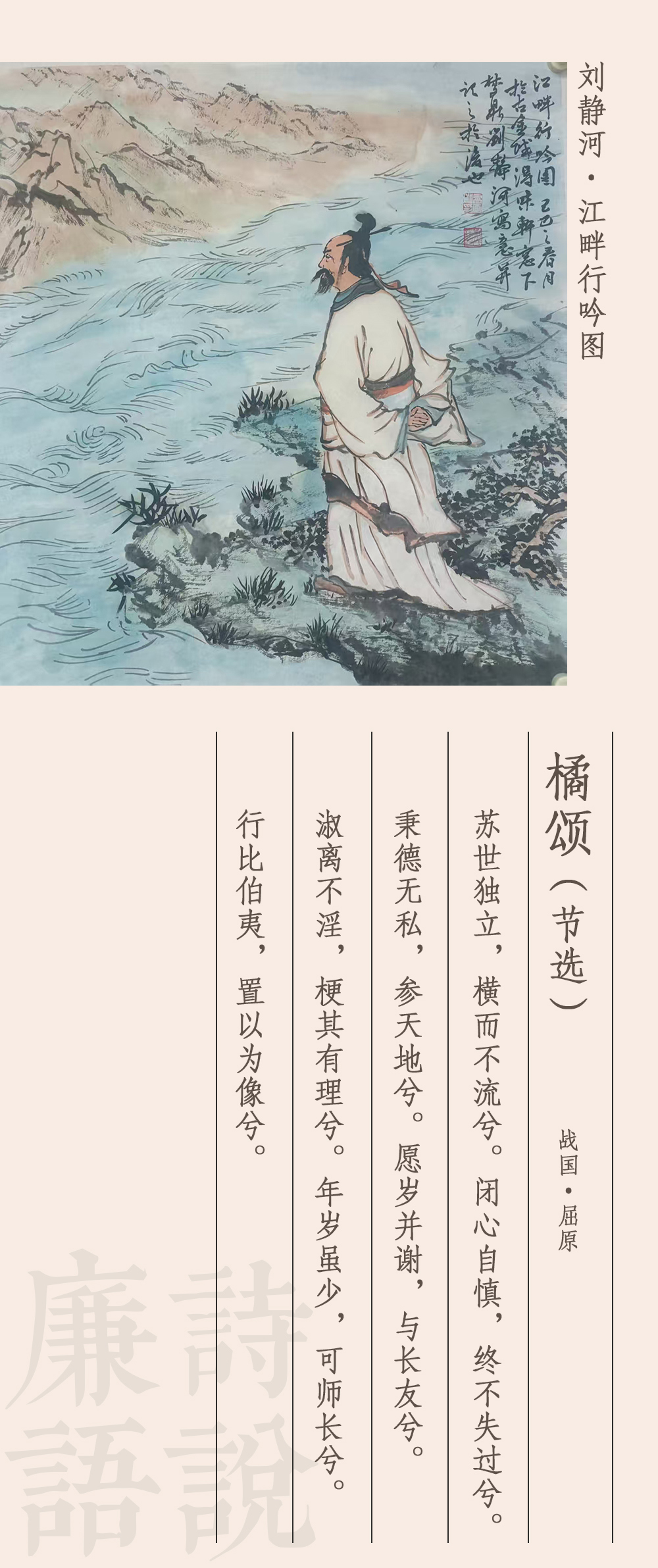 《橘頌》被譽為中國最早的詠物詩。據(jù)考證,屈原在流放之初,苦悶憤激,看到南國的橘樹,心有所觸,將橘樹人格化,賦予其君子仁人的品格,寫下了這首詩。詩分兩部分,前半部分寫實,刻畫了橘樹的生長習性和枝葉花果,后半部分抒情議論,托物言志,橘人合一,情景交融。這里節(jié)選了后半部分,大意如下:清醒立世啊不隨波逐流,小心謹慎啊過失從不留,沒有私欲啊與天地比儔,我與你同生死啊永結為好友,你形象美好啊耿直作一流,你風華正茂啊堪為好師長,你高潔比伯夷啊榜樣最優(yōu)秀。