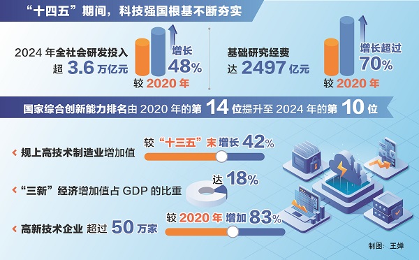 “這五年,科技創(chuàng)新能力穩(wěn)步提升,科技強國根基不斷夯實。”陰和俊說,我國科技投入持續(xù)增加,2024年全社會研發(fā)投入超3.6萬億元,較2020年增長48%;基礎研究經(jīng)費達2497億元,較2020年增長超過70%,在量子科技、生命科學、物質(zhì)科學、空間科學等領域取得一批重大原創(chuàng)性成果;國家實驗室體系建設穩(wěn)步推進,國家科研機構、高水平研究型大學科研能力不斷提升,科技領軍企業(yè)加快培育成長;北京、上海、粵港澳大灣區(qū)國際科創(chuàng)中心支撐引領和輻射帶動作用不斷增強,深圳-香港-廣州躍居全球百強創(chuàng)新集群榜首;國家綜合創(chuàng)新能力排名由2020年的第14位提升至2024年的第10位。