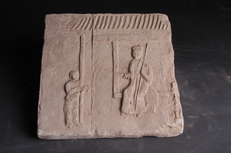 宋代。縱30.2厘米,橫30.7厘米,厚3厘米。征集。磚呈長方形,青灰色,通過模印工藝展示了屋檐下一婦人坐于窗臺前,給一端物的幼子訓話的場景,是研究宋代社會生活、家庭倫理及畫像磚藝術的珍貴實物資料。