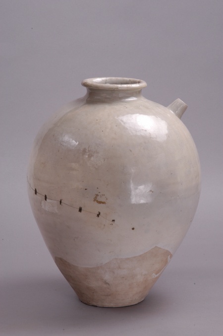 唐代,移交,初出土于武威弘化公主墓。高40.5厘米,口徑12厘米,底徑12.3厘米。圓唇,小口外卷沿,束頸,圓肩,下腹斜收,平底。肩部斜置一管狀短流。胎表有白色化妝土,通體施白釉,釉不及底,釉面光潤(rùn)且有細(xì)碎冰裂紋。器身無花紋,造型規(guī)整、飽滿,具有鮮明的唐代風(fēng)格。
