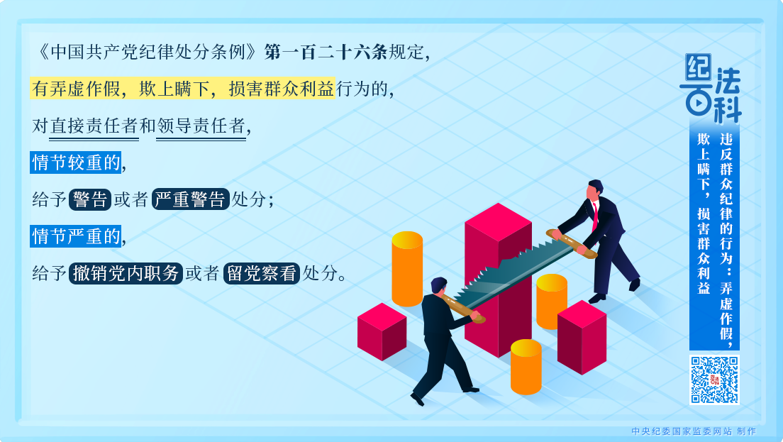 《中國共產(chǎn)黨紀(jì)律處分條例》第一百二十六條規(guī)定,有弄虛作假,欺上瞞下,損害群眾利益行為的,對(duì)直接責(zé)任者和領(lǐng)導(dǎo)責(zé)任者,情節(jié)較重的,給予警告或者嚴(yán)重警告處分;情節(jié)嚴(yán)重的,給予撤銷黨內(nèi)職務(wù)或者留黨察看處分。