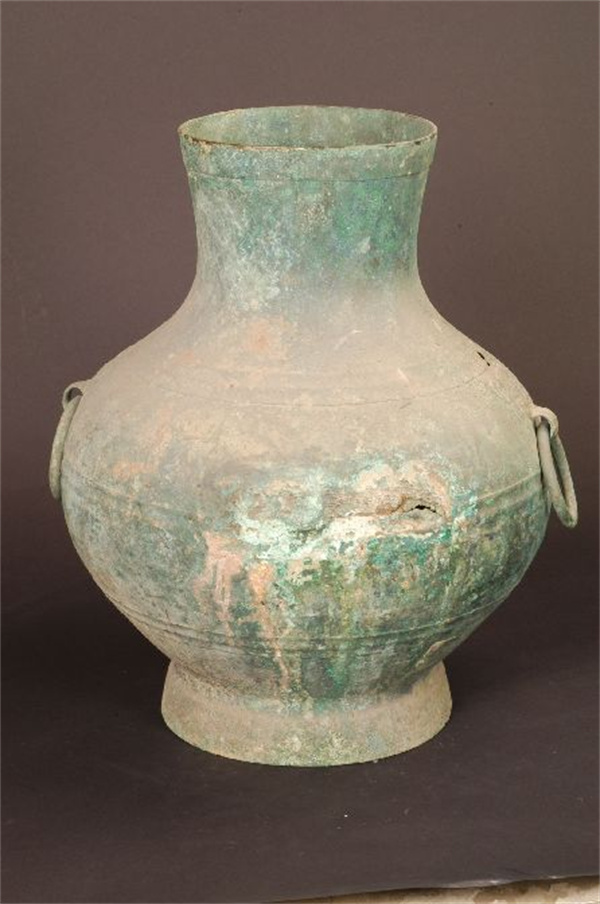 漢代,武威雷臺(tái)漢墓出土。高44.2厘米,口徑18.1厘米,底徑21.9厘米。直口,圓腹,假圈足,腹部有三組瓦紋和對(duì)稱的兩個(gè)獸面銜環(huán)輔首,腹上部篆書“巨李鍾”三字。李,姓氏?!墩f(shuō)文•金部》:“鐘,酒器也。從金,重聲。”