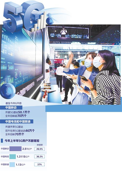從5G基站看,截至今年6月底,中國(guó)移動(dòng)已開(kāi)通5G基站50.1萬(wàn)個(gè),全年目標(biāo)超過(guò)70萬(wàn)個(gè);中國(guó)電信和中國(guó)聯(lián)通共建共享5G基站,目前雙方在用5G基站達(dá)46萬(wàn)個(gè),全年目標(biāo)也是70萬(wàn)個(gè)。工信部數(shù)據(jù)顯示,截至今年6月底,我國(guó)累計(jì)建設(shè)5G基站96.1萬(wàn)個(gè),覆蓋全國(guó)所有地級(jí)以上城市,5G手機(jī)終端連接數(shù)達(dá)3.65億戶,占全球80%以上。