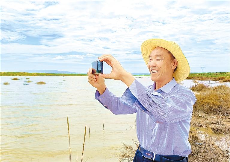 八步沙林場場長郭萬剛在“紅沙湖”畔拍照。新甘肅·甘肅日報記者 金奉乾