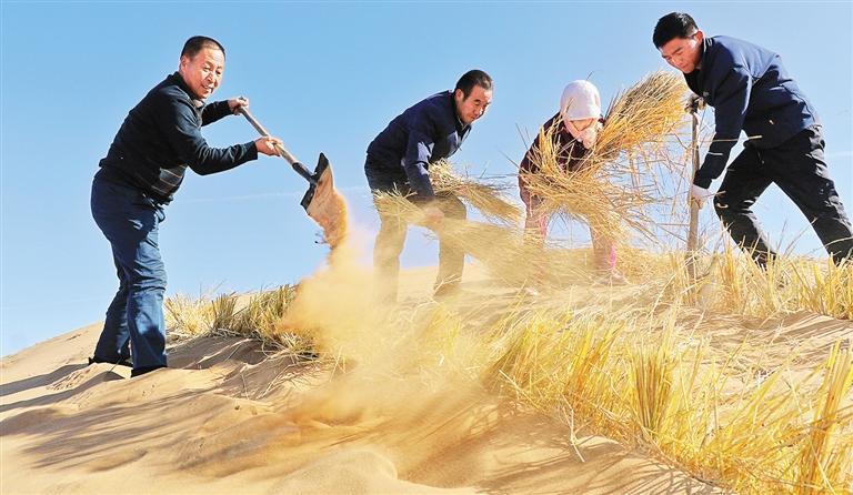 古浪縣八步沙林場工人在騰格里沙漠邊緣打草方格壓沙。甘肅省大力弘揚(yáng)“時(shí)代楷模”八步沙林場“六老漢”的奮斗精神,2012年至2021年,全省累計(jì)完成植樹造林4321.21萬畝,沙化土地綜合治理2015萬畝。張文燦攝(中經(jīng)視覺)