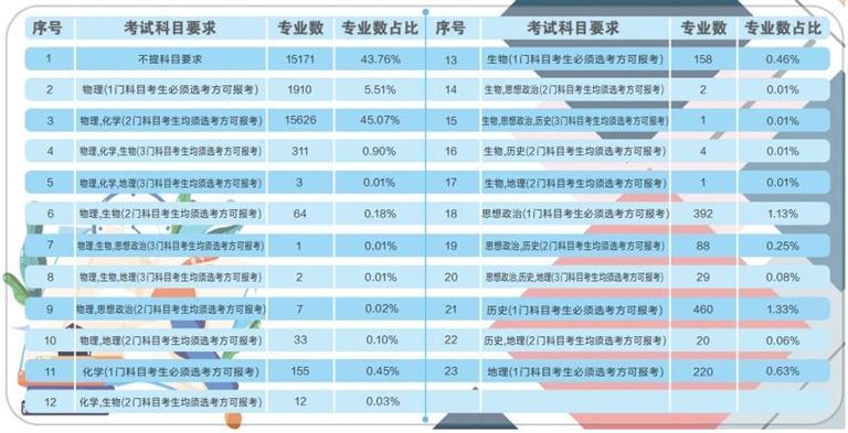 據(jù)了解,根據(jù)《甘肅省深化高等學(xué)校考試招生綜合改革實施方案》要求,從 2021年秋季入學(xué)的普通高中一年級學(xué)生開始,實行基于統(tǒng)一高考和高中學(xué)業(yè)水平考試成績、參考綜合素質(zhì)評價的高??荚囌猩J?。到2024年,基本形成分類考試、綜合評價、多元錄取的高??荚囌猩贫?,健全促進(jìn)公平、科學(xué)選才、監(jiān)督有力的高校考試招生體制機(jī)制。此次在我省報送選考科目要求的高校專業(yè)共計64092條,其中本科專業(yè)34670條。專業(yè)選考科目要求共有23種組合,其中不提科目要求的本科專業(yè)數(shù)量占本科專業(yè)總數(shù)的43.76%,含物理科目的占比為51.79%,含化學(xué)科目的占比為46.46%,含歷史科目的占比為1.74%,含“物理+化學(xué)”科目的占比為45.98%。