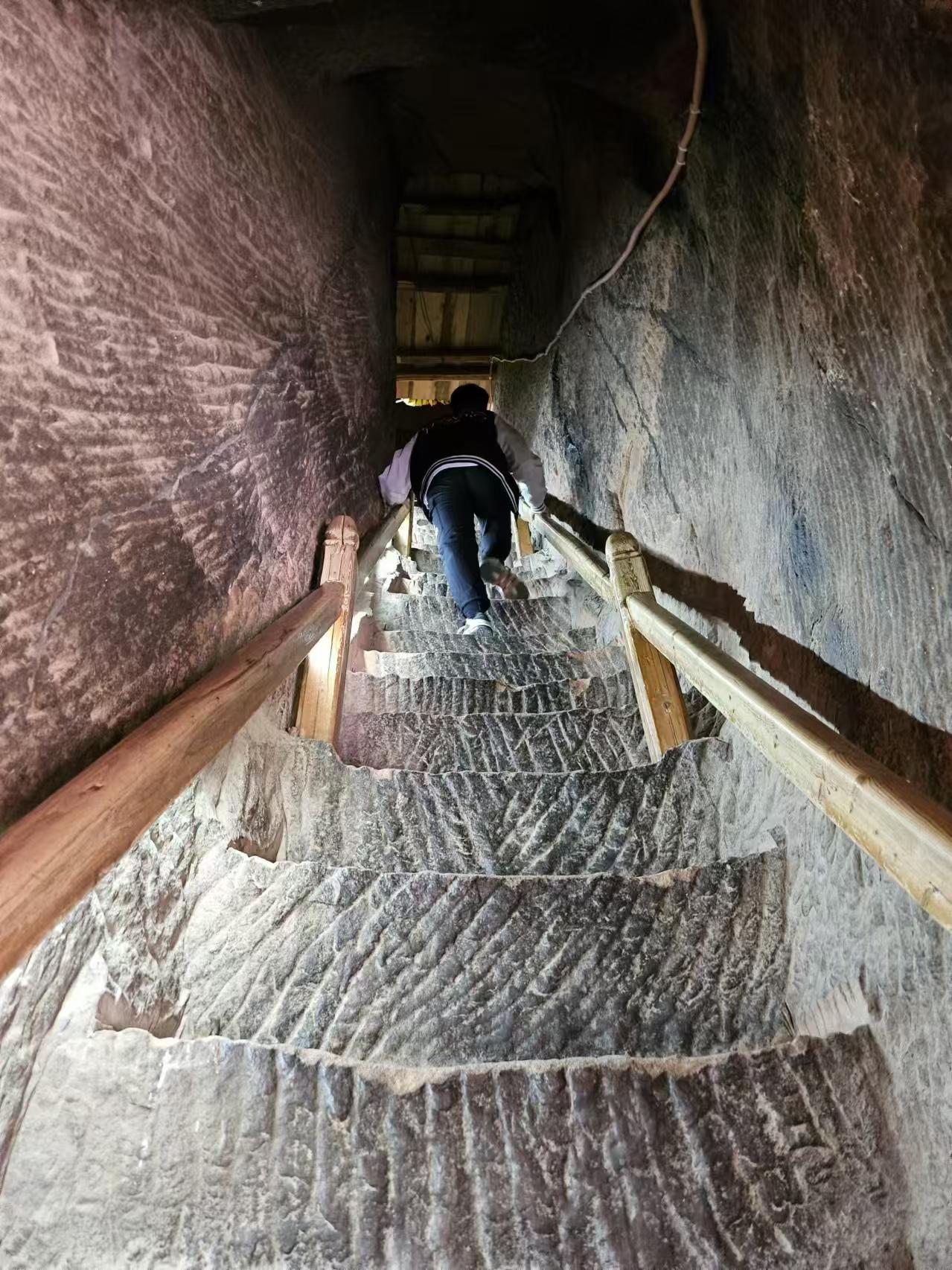 由第一層的北邊入內(nèi),隧道呈“之”字形,回廊曲折。里邊只能容納一個(gè)人行走,兩個(gè)人并坐,一共上去有129個(gè)臺(tái)階。石窟中的石砌臺(tái)階百轉(zhuǎn)千回,高低不一,不少階梯需要手腳并用才能上去,其艱難程度激發(fā)了游客的攀登欲,也有了“不到長(zhǎng)城非好漢,不登三十三天真遺憾”的說法。