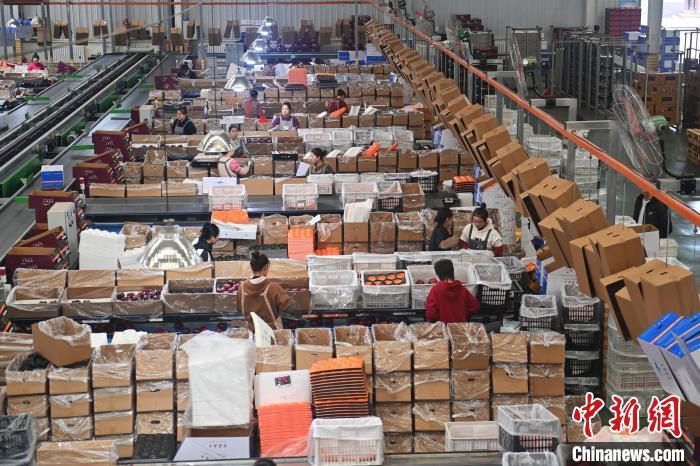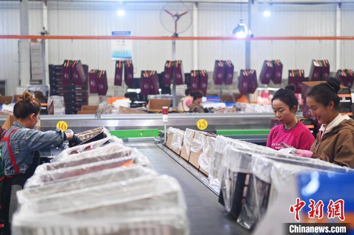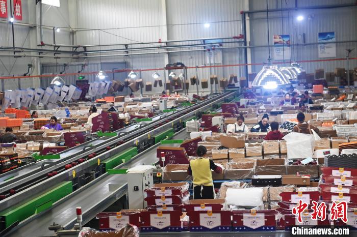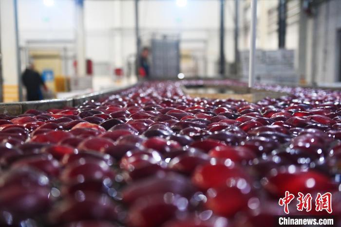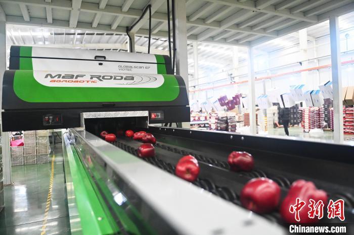 10月21日,在甘肅省天水市秦安縣雪原果品有限公司加工車間,蘋果自動化分揀線上工作人員進行分揀工作。該生產(chǎn)線每天能處理30噸蘋果,蘋果經(jīng)過設(shè)備水洗、烘干、稱重等環(huán)節(jié),進入不同等次的包裝線,工人們再對每顆蘋果進行復(fù)檢、貼標,分裝在不同規(guī)格的包裝箱中。甘肅秦安蘋果總面積61.37萬畝,產(chǎn)量86.8萬噸,產(chǎn)值55.6億元人民幣,先后從國內(nèi)科研院所引進青砧、M26、ZH5等抗重茬蘋果矮化砧木6個,配合國家蘋果產(chǎn)業(yè)技術(shù)體系,引進長富2號、煙富6號、煙富8號、瑞香紅等蘋果新品種12個。中新社記者李亞龍攝