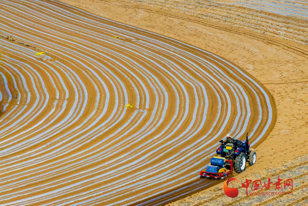 春日,走進(jìn)定西臨洮的田間地頭,一壟壟覆膜蜿蜒如銀色絲帶,在暖陽(yáng)下泛起粼粼波光。洮河水畔,杏花初綻,村民們正彎腰點(diǎn)種、培土壓膜。新翻的泥土氣息混著花香彌漫田間。農(nóng)機(jī)轟鳴處,白膜與藍(lán)天相映,勾勒出黃土高原上最動(dòng)人的春耕畫卷。