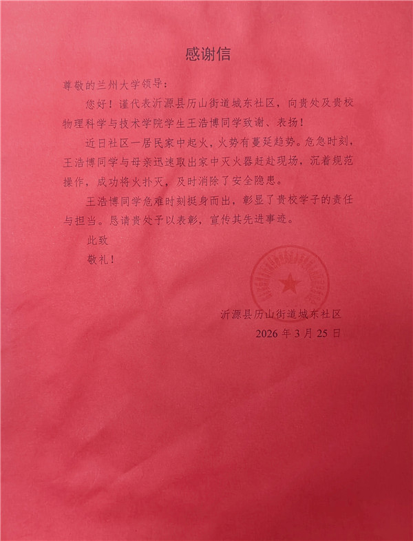 近日,一封社區(qū)致蘭州大學的感謝信,讓該校物理科學與技術(shù)學院學生王浩博的暖心事跡走進公眾視野。2026年3月3日,元宵夜,放假居家的他偶遇居民樓突發(fā)火情,憑借校園培訓習得的消防技能,沉著處置初起火災(zāi)、轉(zhuǎn)移危險物品,以本能之舉守護鄰里安全,彰顯新時代青年的責任與擔當。