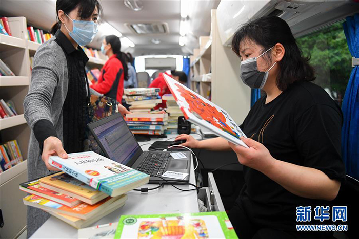 3月26日,在長沙岳麓區(qū)石嶺塘社區(qū),市民在流動圖書館里辦理借書。 近日,在做好疫情防控工作的同時,長沙流動圖書館恢復運營。長沙流動圖書館是長沙圖書館的總分館流動服務項目之一,以大巴車為載體,每月定期到社區(qū)、學校、企業(yè)、工地等區(qū)域,為市民提供閱覽、咨詢、辦證、借書、還書等便捷化公共服務。 新華社記者 陳澤國 攝