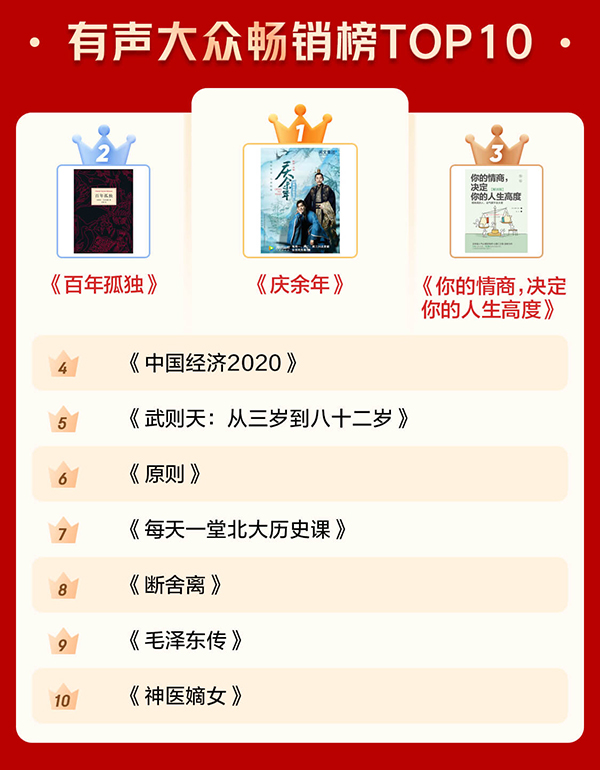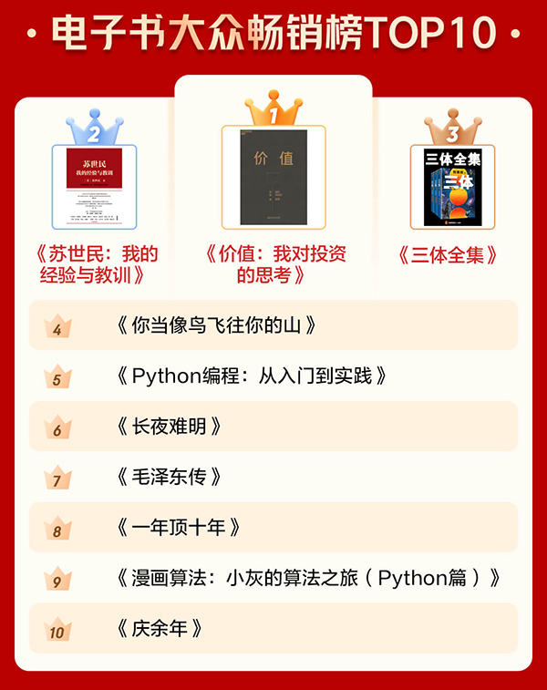 通過電子書暢銷榜TOP10和有聲暢銷榜TOP10可以看出,很多人愈發(fā)關(guān)注投資和管理等方面的內(nèi)容,也愈發(fā)注重個人學(xué)習(xí)?!秲r(jià)值:我對投資的思考》《蘇世民:我的經(jīng)驗(yàn)與教訓(xùn)》 分別位居電子書暢銷榜第一名和第二名?!吨袊?jīng)濟(jì)2020》《原則》進(jìn)入有聲暢銷榜前十。此外,學(xué)習(xí)類圖書《Python編程:從入門到實(shí)踐》《漫畫算法:小灰的算法之旅(Python篇)》也上榜電子書暢銷榜前十。