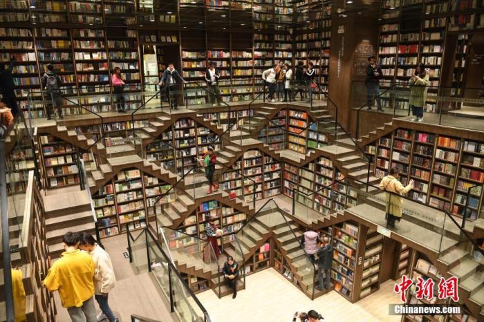 資料圖:重慶九龍坡區(qū)商圈內(nèi),一書店因設(shè)計(jì)感非常獨(dú)特,吸引了不少民眾前來(lái)打卡玩耍。陳超 攝