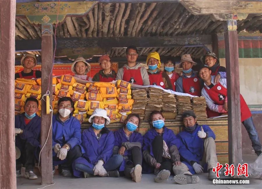 西藏自治區(qū)古籍保護中心工作人員和大學生志愿者整理古籍后合影。受訪者供圖。