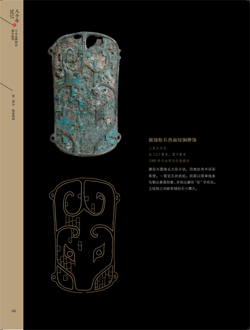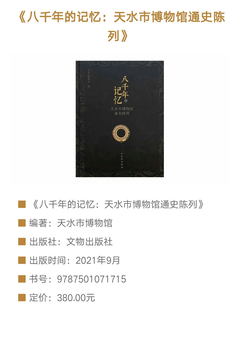 《八千年的記憶——天水市博物館通史陳列》圖錄,是在2018年天水市博物館通史陳列展覽提升改造基礎(chǔ)上提煉而成,以天水市博物館能夠反映天水歷史文化面貌的館藏精品文物為重點,輔之以天水地區(qū)出土的藏于其他文物機構(gòu)的重點文物,旨在展示天水八千年歷史文脈和文明成就。全書共分為文明曙光、嬴秦故園、兩漢物華、魏蜀兵戈、渭水梵音、隋唐盛景、茶馬大市、古城遺韻8個部分,擷集天水文物精粹,在展現(xiàn)天水自舊石器時代至明清時期完整歷史序列的同時,突出了獨具天水特色的歷史文化資源。