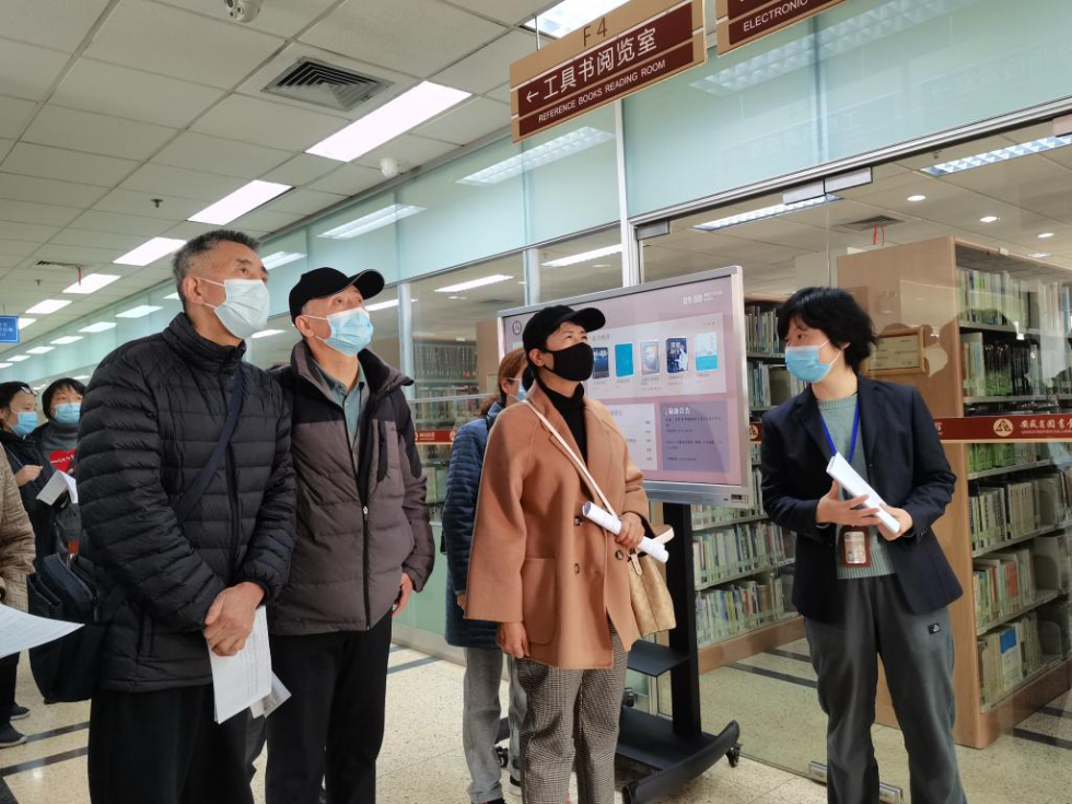 圖書館里的志愿者老師帶領(lǐng)老人游覽圖書館,并用英語進行講解。新華社記者汪海月攝