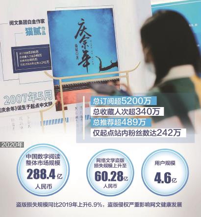 有數(shù)據(jù)顯示,2020年中國網(wǎng)絡(luò)文學(xué)市場規(guī)模為288.4億元,網(wǎng)絡(luò)文學(xué)通過IP全版權(quán)運營間接或直接影響了動漫、音樂、影視、游戲等合計約2531億元的市場,對數(shù)字文化產(chǎn)業(yè)的影響范圍超過40%。但令人痛心的是,2020年中國網(wǎng)絡(luò)文學(xué)盜版損失規(guī)模達(dá)60.28億元,同比上升6.9%。