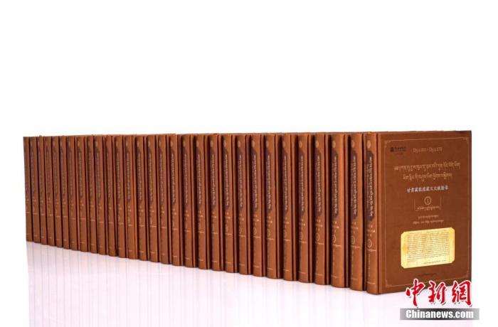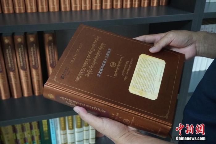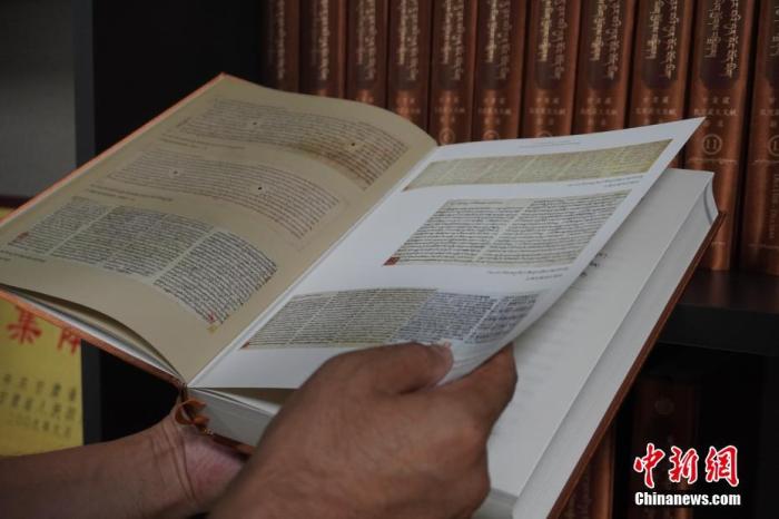 8月26日,甘肅蘭州,甘肅民族出版社資料室內(nèi)收藏的《甘肅藏敦煌藏文文獻勘錄》。該叢書共30卷,約2205余萬字,收錄了6700余件甘肅藏敦煌藏文文獻,系國內(nèi)外首次以全文錄入的方式出版。 中新社記者 九美旦增 攝