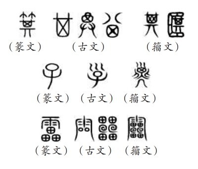 ?。ㄎ澹┧^“9353”,指的是《說文》所收全部正篆,即《說文》分析解釋的全部字。《說文》收字以篆文為“正”,作為標(biāo)準(zhǔn)字體,這就是許慎所說的“今敘篆文,合以古籀”的收字原則。“今敘篆文”,就是以篆文(小篆)作為標(biāo)準(zhǔn)正字,同時(shí)也會根據(jù)需要收列部分古文和籀文?!墩f文》所謂“古文”主要是孔子壁中書和民間所獻(xiàn)古文經(jīng)所用的文字,“籀文”即傳為西周晚期太史籀所編字書《史籀篇》上的文字。從《說文》來看,收入的古文、籀文,主要是與篆文有明顯差異的字形。如篆文“箕”“子”“雷”下所收列的古文、籀文: