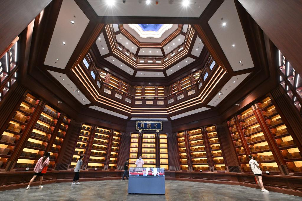 2022年7月30日,觀眾在中國國家版本館中央總館文瀚廳內(nèi)參觀。中國國家版本館是國家版本資源總庫和中華文化種子基因庫,由中央總館文瀚閣、西安分館文濟閣、杭州分館文潤閣、廣州分館文沁閣組成,歷時三年建設(shè),全面履行國家版本資源保藏傳承的職責(zé)。