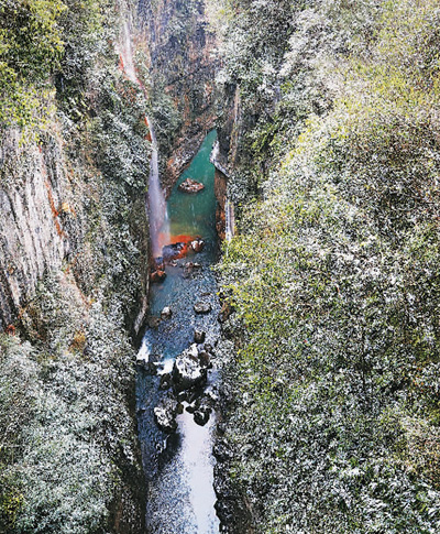 雪花飄飄,沿棧道往下走,山林被染成一幅黑白山水畫。風(fēng)雨橋在地縫之上凌空飛舞,仿佛是通往地心的鑰匙。約75米深的云龍絕壁垂直下切,狹長,呈U型,崖壁皺紋黑灰,宛若剛出鞘的寶劍閃著寒光。底下是云龍河,水淺,清澈,叮叮咚咚,增添些許歡快,而讓地縫變得富有激情的是沐撫盆地流出的7條瀑布,其中最美的是五彩黃龍瀑布。瀑布從60米高的峭壁跌落下來,纖細(xì),飄灑,婀娜。“銀花下散布水臺(tái),混沌鑿破山根隈。”從暗河流出的水含黃鐵礦,把巖壁和卵石刷洗得斑斕,連河水也變得絢麗。