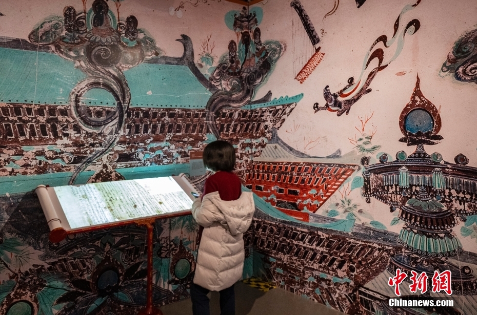 圖為觀眾在“敦煌遺書”展區(qū)內(nèi)的沉浸式體驗(yàn)區(qū)參觀。 中新社記者 侯宇 攝