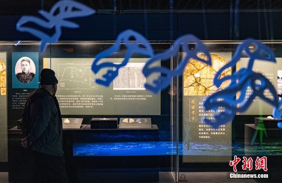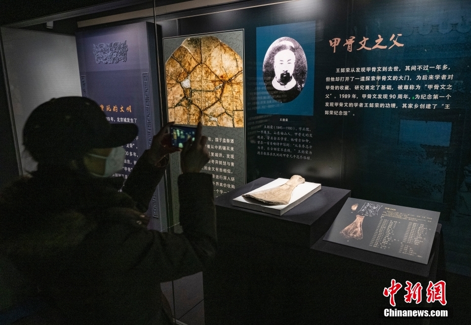 圖為“殷墟甲骨”展區(qū)內(nèi)一位觀眾參觀“甲骨文之父”王懿榮的介紹。 中新社記者 侯宇 攝