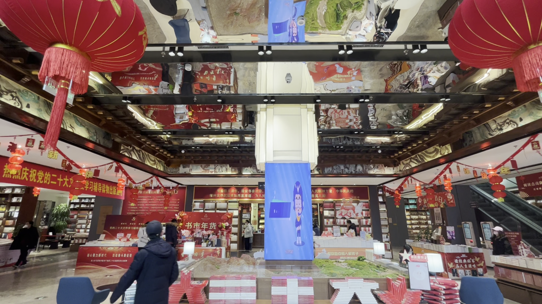 走進甘肅省新華書店西北書城,這里裝扮一新,高高掛起的大紅燈籠烘托出濃濃的年味,敦煌文化元素的有機融入,讓中華優(yōu)秀傳統(tǒng)文化在這里流光溢彩。書城一樓的主題出版物展區(qū),勉勵人們熱愛讀書的標語豁然醒目 。