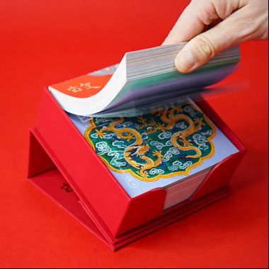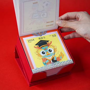 如意取出第一層里紅紅的燙金書(shū)刊盒,馬上發(fā)現(xiàn)了它的小機(jī)關(guān):原來(lái)盒蓋上有個(gè)吸鐵石,把它翻過(guò)來(lái),就可以25度傾斜地放在書(shū)桌上,舒服地翻閱一整年的“日子”;每一天的頁(yè)面都能被絲滑地撕下,作為小書(shū)簽,插在課本讀物中。