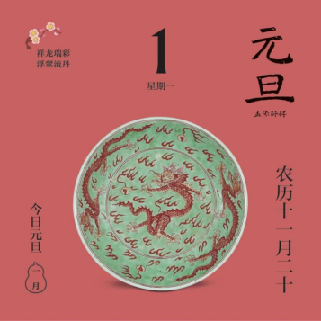 翻開(kāi)新年伊始的“元旦”頁(yè),映入眼簾的是一個(gè)綠色的盤子,上面有三條雄勁矯健的“龍爺爺”,它們來(lái)自清代吧!如意輕輕撕下日歷頁(yè)翻到反面,讀起文物小故事:“我是淡綠地礬(fán)紅彩云龍紋盤……”