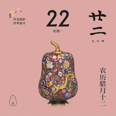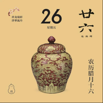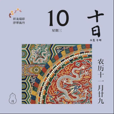 翻開(kāi)1月月份頁(yè),首先跳入眼簾的,是主題詞“祥龍瑞彩”。這個(gè)月以絢麗的顏色為主線,串起各色龍文物,比如精致的宋代單色釉龍紋盤,絢麗的故宮官式建筑和璽彩畫,還有優(yōu)雅的清代掐絲琺瑯游龍花卉紋瓜式蓋罐……