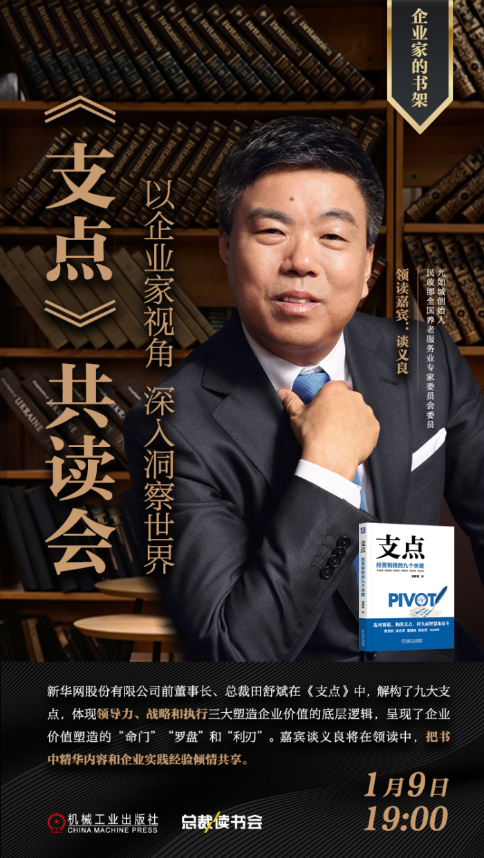 為了企業(yè)家更好地塑造企業(yè)價(jià)值,提升格局和眼界,1月9日19:00九如城創(chuàng)始人談義良將領(lǐng)讀《支點(diǎn)》一書(shū),將在“認(rèn)識(shí)管理”視頻號(hào)上進(jìn)行直播。通過(guò)如何從多維度視角塑造企業(yè)價(jià)值、如何提升企業(yè)家的格局和眼界、如何做好團(tuán)隊(duì)塑造,構(gòu)筑人力資本基石三個(gè)方面,從企業(yè)家視角把書(shū)中精華內(nèi)容和企業(yè)實(shí)踐經(jīng)驗(yàn)傾情共享,千萬(wàn)別錯(cuò)過(guò)。