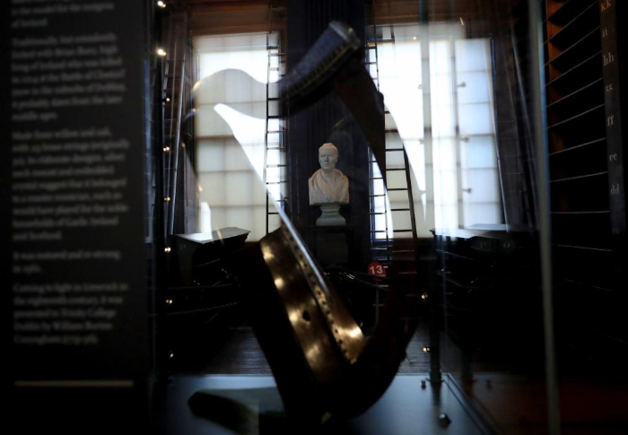 這是在愛爾蘭都柏林大學圣三一學院老圖書館拍攝的豎琴和雕像(1月16日攝)。