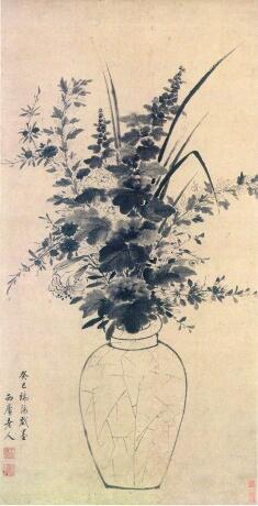 清初畫家王時(shí)敏的《端午景圖》《端陽(yáng)墨花圖》,將艾草、蜀葵、柳條、石榴花等時(shí)令花草引入畫中,寄予驅(qū)邪納福的寓意。畫中所寫花草濃墨與淡墨相間,層次分明,體現(xiàn)出駕馭水墨的嫻熟技藝。值得一提的是,《端午景圖》中的瓷瓶為帶冰裂紋的豐肩斂腹瓶,這種將瓷器表面花紋如實(shí)描繪出來(lái)的現(xiàn)象,在古代花鳥畫中并不多見(jiàn),由此可見(jiàn)畫家獨(dú)特的筆墨趣味。