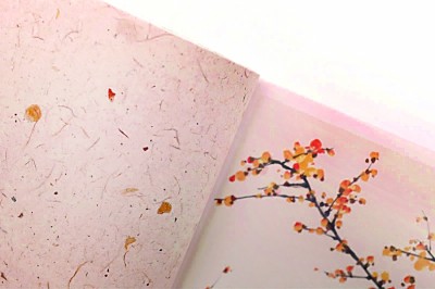 低首聞香,竹葉紙、桂花紙、蠟梅紙散發(fā)著獨(dú)有清香,在花葉紙上還能夠觸摸到真實(shí)的植物肌理;荸薺紙、無(wú)患子紙等果實(shí)紙上融入了肉眼可見的顆顆果粒;蜀葵紙、黃山欒紙、柿子紙等植物染色紙色彩繽紛,浸染著植物的天然原色;水印紙薄如蟬翼,透光可見植物圖案……摩挲間,24種花草紙有著獨(dú)屬于不同時(shí)節(jié)的味道,自然之美,蘊(yùn)蓄其中。