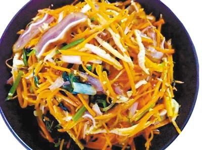 ● 做法:以地產蔬菜胡蘿卜、菠菜和綠豆芽,搭配耳絲、口條、肝片而成,色澤明快、微酸適口:胡蘿卜絲用少許鹽腌至脆柔、綠豆芽焯水保持白嫩、綠菠菜焯過捏去水分切成寸段,這三樣食材搭配營養(yǎng)成分暫且不說,單就紅、白、綠三色,就足夠醒目了。正宗的天水酒碟還要配以鹵豬耳、豬肝和煮熟的拆骨肉,最后點綴以綠綠的香草。
