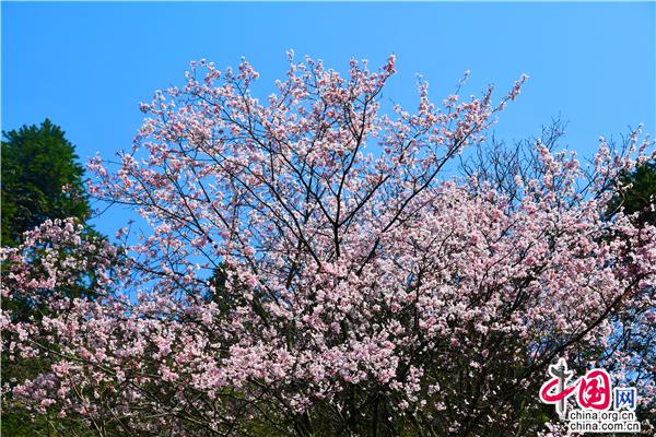 湖南新邵“長壽村”萬畝櫻花怒放 宛若七彩水墨畫