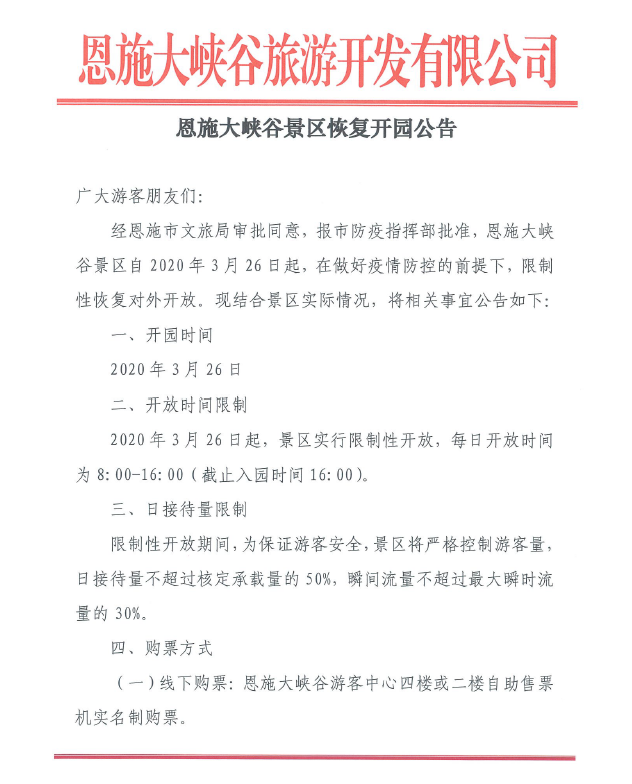 恩施大峽谷旅游開發(fā)有限公司今天發(fā)布《恩施大峽谷景區(qū)恢復(fù)開園公告》(以下簡稱《公告》),2020年3月26日起,恩施大峽谷景區(qū)恢復(fù)開園。值得注意的是,恩施大峽谷將實(shí)行限制性開放,每日開放時(shí)間為8:00-16:00(截止入園時(shí)間16:00)。