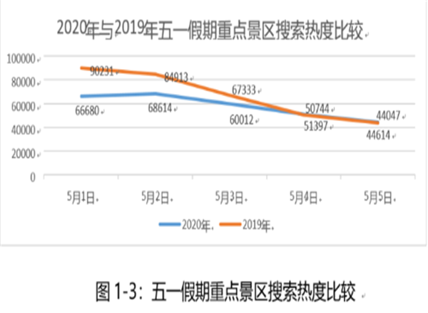 “五一”期間全省重點(diǎn)景區(qū)關(guān)鍵詞搜索熱度為29.1萬(wàn)次,較去年同期33.7萬(wàn)次下降13.6%。
