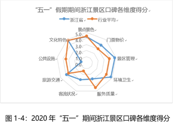 浙江景區(qū)在景區(qū)管理(口碑得分 4.8 分)、門(mén)票物價(jià)(口碑得分3.8分)、環(huán)境衛(wèi)生(口碑得分4.7分)表現(xiàn)較好,領(lǐng)先行業(yè)平均水平,但在交通、服務(wù)方面低于行業(yè)平均水平。
