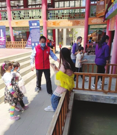 志愿者們不懼烈日,在古鎮(zhèn)開展文明勸導工作。當游客走累了,靠在欄桿處休息時,志愿者立即走過去耐心勸導游客,說明此處危險,并向游客指明休息場所;當有游客爬到景區(qū)禁止攀爬的設施上照相時,志愿者們耐心勸導,引導游客文明照相。在閑暇之余,志愿者還要在古鎮(zhèn)內撿煙頭、撿落地垃圾等。