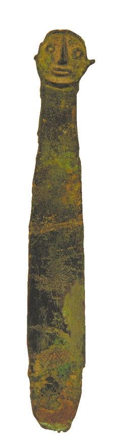 相比刀與叉,匕的出現(xiàn)要稍晚一些,甘肅省博物館收藏有人頭柄銅匕兩把,都是辛店文化(距今3400年—2800年)的產(chǎn)物,兩把人頭柄銅匕都采集于甘肅省廣河縣。一把人頭柄銅匕造型比較拙樸,匕身平直呈長舌狀,末端為圓弧形并微上翹。柄首為人頭形,高鼻,圓眼,厚唇微張,半環(huán)形雙耳,一耳殘缺。另一把人首柄銅匕同前一把人頭柄銅匕造型相似,但做工卻要精美許多,這把銅匕柄首也是人頭形,高鼻,圓眼,圓口,雙耳為半環(huán)形,頸部涂紅色,身體為方格網(wǎng)紋。這把人頭柄的人面雙目圓睜,嘴微張,一副機(jī)靈驚詫的表情,比前一把人頭柄銅匕人面憨直質(zhì)樸的面目更有意趣。這是兩把還沒成為武器的銅匕,但它已經(jīng)有了勺子的雛形。